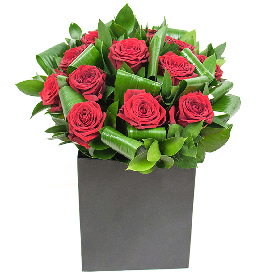 Brighten any room with our radiant red rose bouquet, complemented by vibrant aspidistra leaves and subtle ruscus. This unique floral arrangement exudes elegance and charm, perfect for any occasion.