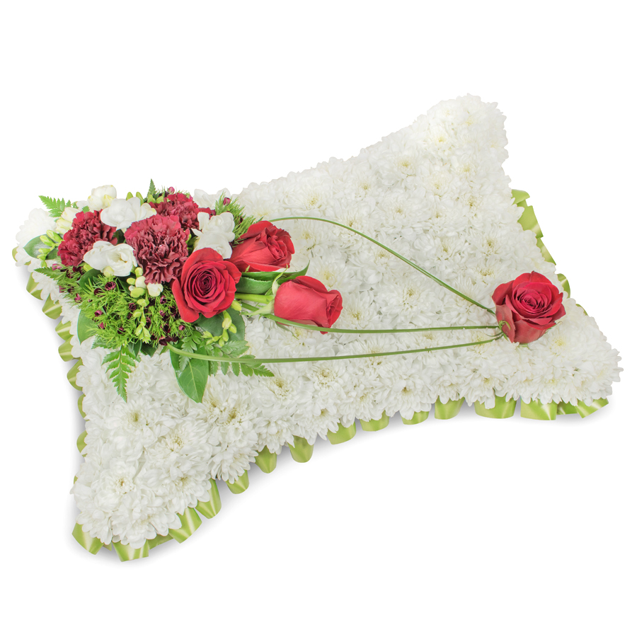 Convey your deepest sympathies with our beautiful condolence arrangement. This exquisite bouquet combines white chrysanthemums, red roses, white freesias, dark red carnations, dianthus, and bear grass to create a graceful and meaningful display.