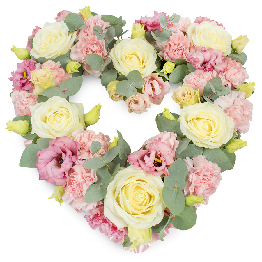 Express your heartfelt condolences with our Luxurious Open Heart Sympathy Bouquet. This opulent arrangement showcases a harmonious blend of white roses, pink carnations, pink lisianthus, and Eucalyptus leaves, elegantly arranged in an open heart shape to symbolize eternal love and remembrance.